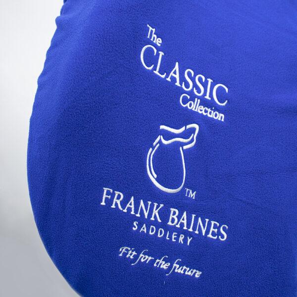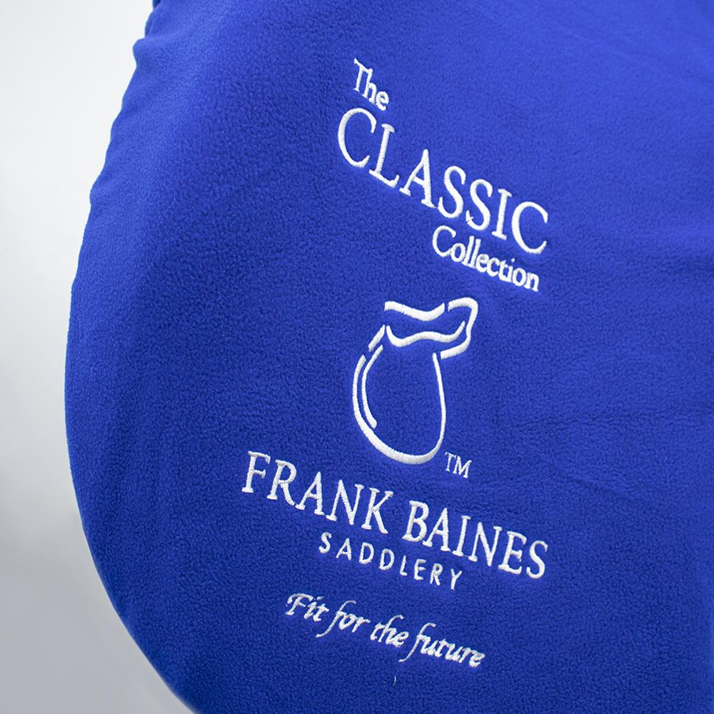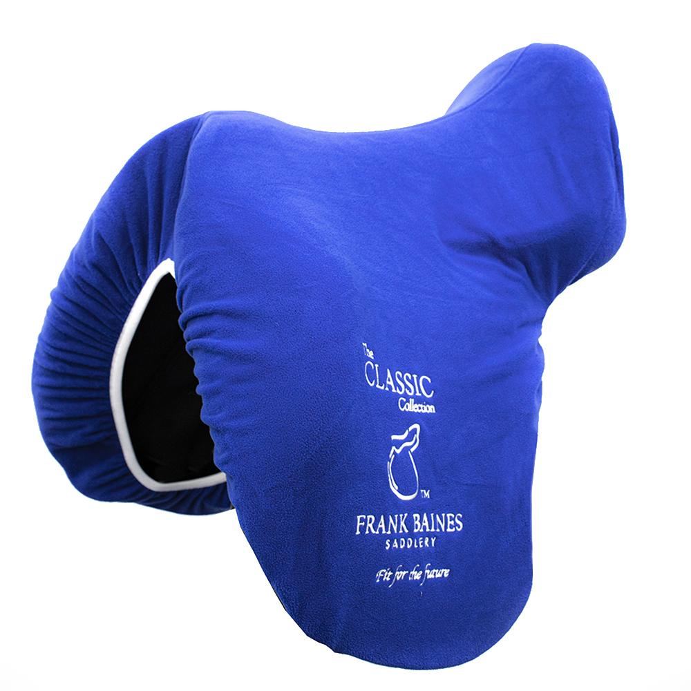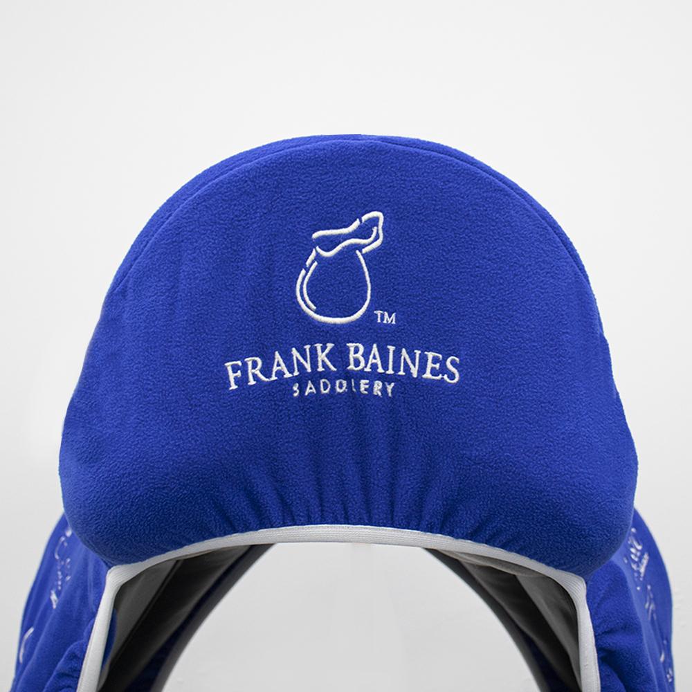 Made from extra soft fleece Elasticated all round for a close, secure fit Royal blue with white binding around the edging Embroidered Frank Baines logo on sides and on the cantle Made from 100% polyester except for trimmings and decoration