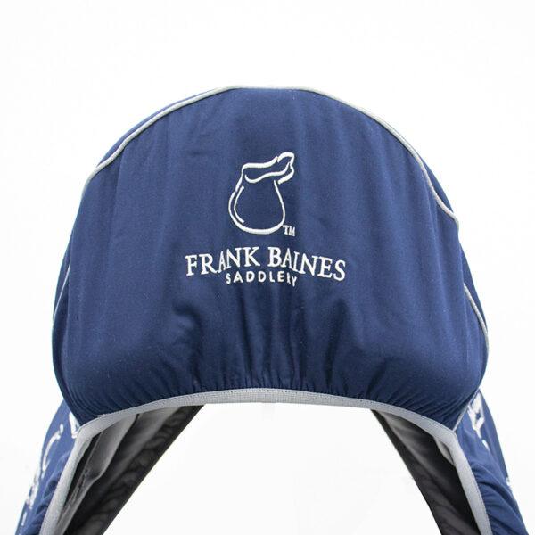 65% polyester and 35% cotton except for trimmings and decoration Lined with 100% polar fleece Elasticated all round for a close, secure fit Navy blue with silver grey binding and lining Embroidered Frank Baines logo on sides and on the cantle